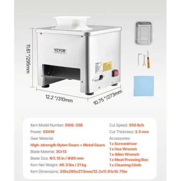 Denna kommersiella köttskärmaskin är utformad för effektiv och precis skivning av benfritt kött och mjuka grönsaker, vilket gör den idealisk för hemmakök, restauranger och stormarknader. Med en kraftfull motor och högkvalitativa blad i rostfritt stål säkerställer den snabb drift och enkel rengöring i hektiska miljöer. Dess hållbara konstruktion och stabila bas ger långvarig prestanda och säkerhet.