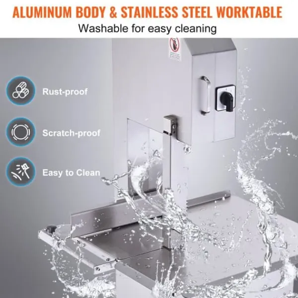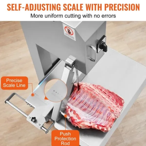 Precis och jämn: Arbetsbordet av rostfritt stål erbjuder en skäryta med precisa skalenheter. Detta gör att den önskade tjockleken kan justeras med högre noggrannhet vid behov. Den kommersiella benknivsmaskinen kan hantera stora bitar av lamm- och nötköttsben. Skärtjockleken kan justeras från 4 till 220 mm, vilket ger utmärkta resultat både för tunna skinkskivor och tjocka benbitar.