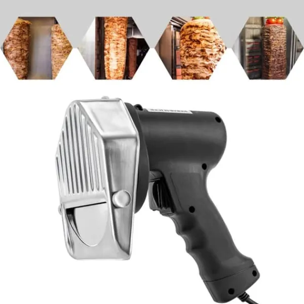 Elektrisk kebabskärare KS-120EEn kraftfull kebabskärare med 12 cm rostfri klinga som levererar snabba, jämna skivor. Steglös tjockleksjustering 0–10 mm, säkerhetskåpa och ergonomiskt grepp gör den perfekt för kök, gatukök och foodtrucks.