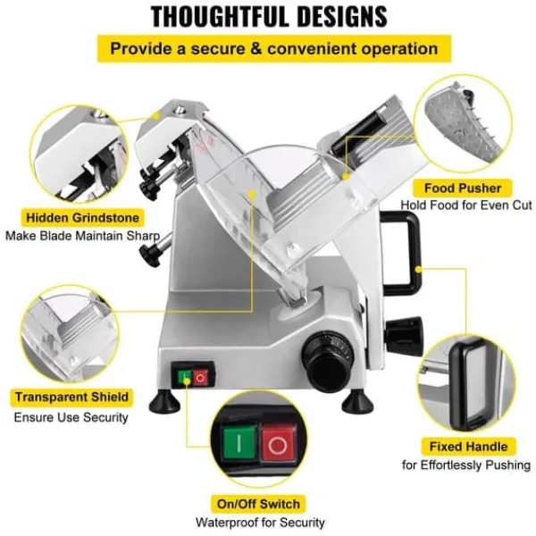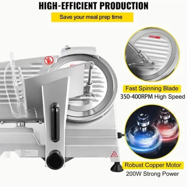 Hög skärprestanda: Vår köttskärare är utrustad med en kraftfull motor med en ingångseffekt på 200 watt, vilket driver kniven till en hastighet av 350 till 400 varv per minut. Det sparar mycket tid och energi.