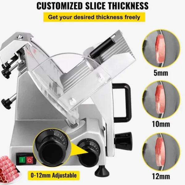 Justerbar skärtjocklek: Skäraren har en justeringsknapp för skärtjocklek som sträcker sig från 0 till 12 mm (0-0,47 tum). Du kan enkelt anpassa tjockleken efter dina förberedelsebehov, perfekt för hamburgare, smörgåsar, charkuterier, fruktsallader och mycket mer.