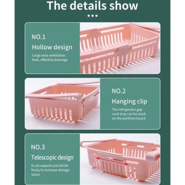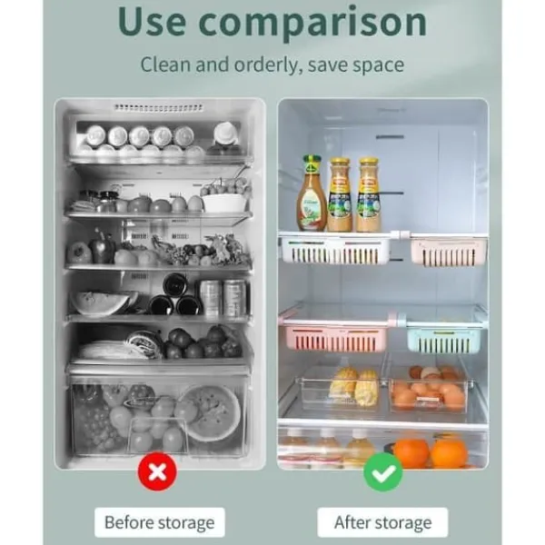 Organisera ditt kylskåp med detta paket med 4 utdragbara förvaringslådor. Finns i rosa, blått, kaki och vitt, de passar hyllor som är mindre än 0,8″. Idealiska för att hålla dina livsmedel i ordning och optimera utrymmet.