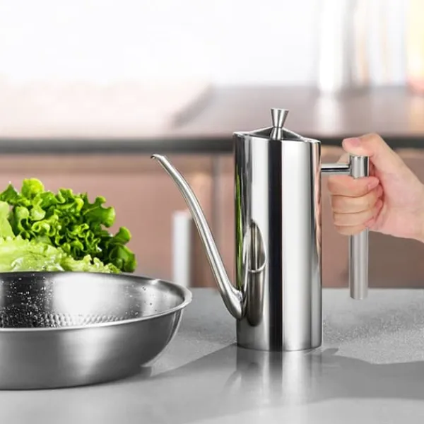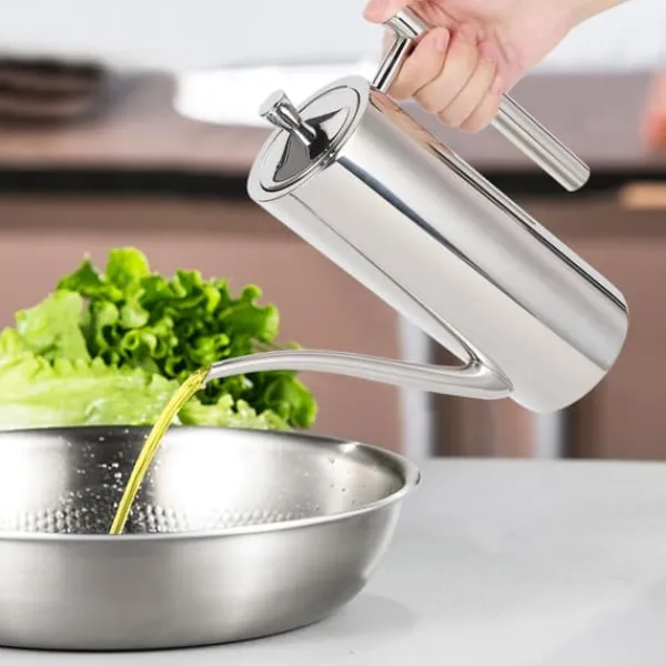 Vi introducerar vår oljekruka i rostfritt stål, gjord av rostfritt stål av livsmedelskvalitet, vilket säkerställer hållbarhet, korrosionsbeständighet och slitstyrka. Du kan använda den med sinnesfrid.