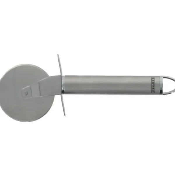 Upptäck pizzaskäraren LEIFHEIT 24067 med verktygsdelar i rostfritt stål, handtag i rostfritt stål och krom och avancerad design. Dess huvudfärg är grå.