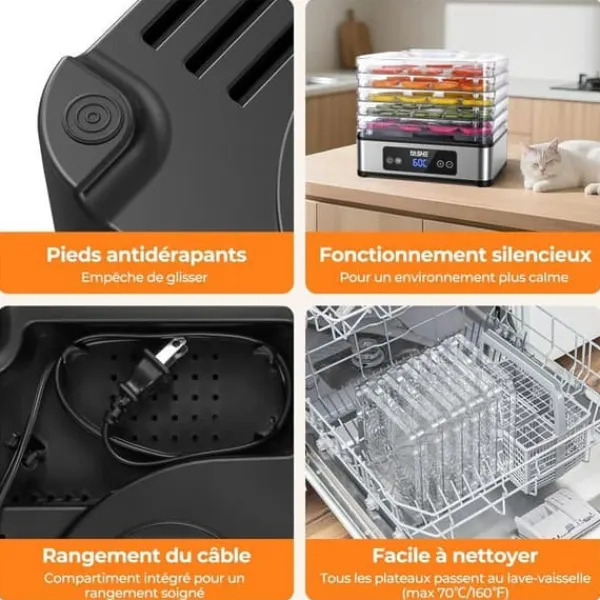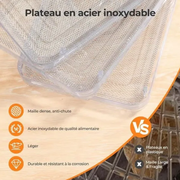 Livsmedelsbricka i Rostfritt Stål: Denna tork är utrustad med 5 brickor i rostfritt stål som uppfyller livsmedelssäkerhetsstandarder. Den BPA-fria kroppen och basen i rostfritt stål förstärker hållbarheten och estetiken hos denna livsmedelstork.
