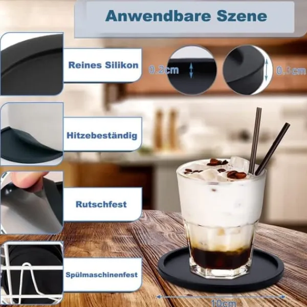 Dessa silikonunderlägg passar alla typer av muggar och glas, oavsett om det är iskallt vatten, varmt vatten, kaffekopp, ölglas eller flaskdryck. De står stadigt på bordet och förhindrar halkning samt skyddar ytan från vattenringar, fettfläckar och värmeskador.