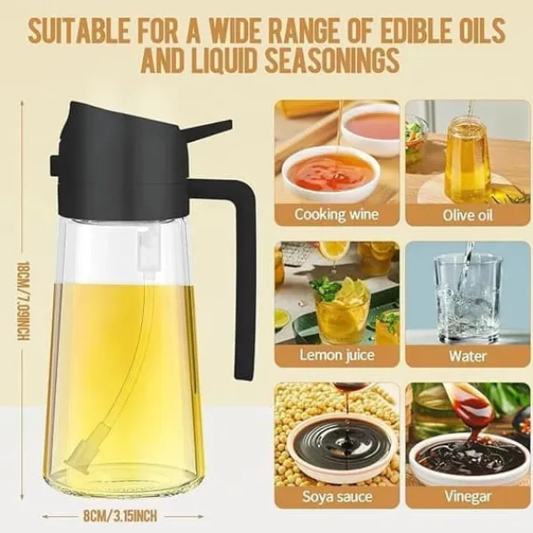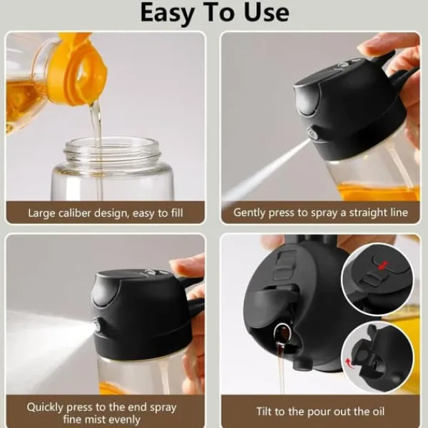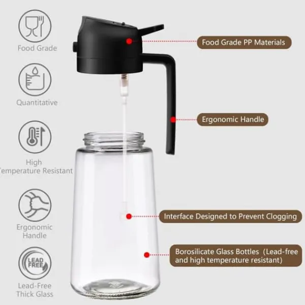 Bekväm användning: Framåtriktad spraymunstycke ger fin och jämn oljedimma utan droppar; bakre handtag gör det enkelt att hälla eller spraya och håller händerna rena för en smidig och oljefri användarupplevelse.