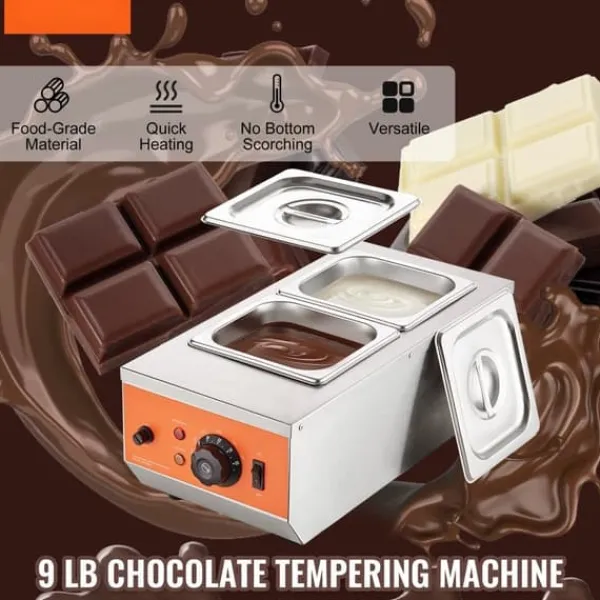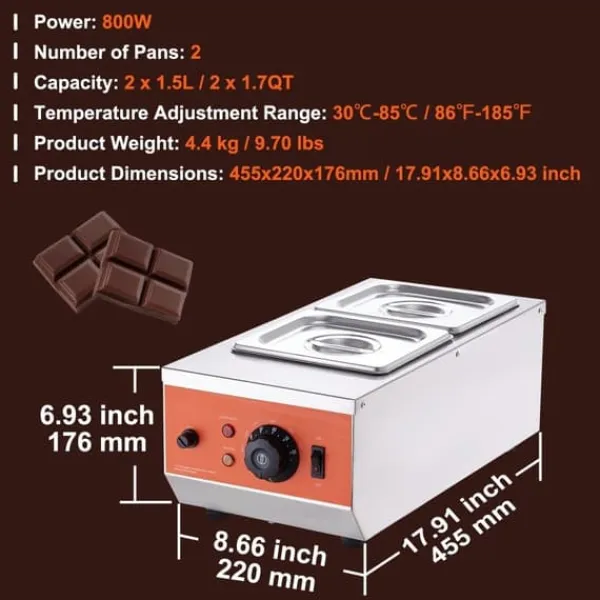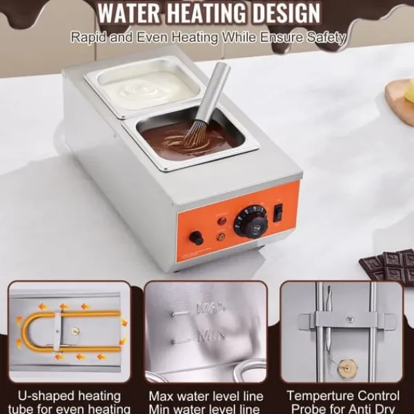 Snabb uppvärmning: Det inre M-formade värmeröret och vattenbadet ger en hög effekt på 800 W för snabb uppvärmning, utan att chokladen fastnar i botten. Chokladen värms jämnt, vilket resulterar i en bättre flytande blandning och slätare såser. Den maximala vattennivån på insidan av grytan förhindrar att vattnet kokar över, medan den minimala vattennivån förhindrar att enheten brinner torrt, vilket förlänger livslängden på chokladtempereringsapparaten.