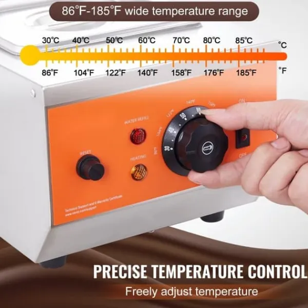 Precisionstemperaturkontroll: Temperaturen kan manuellt justeras mellan 30 och 85 ºC (86 till 185 ºF), vilket möjliggör noggrann temperaturkontroll. Denna professionella elektriska vattenvärmare kan uppfylla dina olika värmebehov och smälta olika typer av chokladblock med hög effektivitet, så att de kan smältas och användas omedelbart.