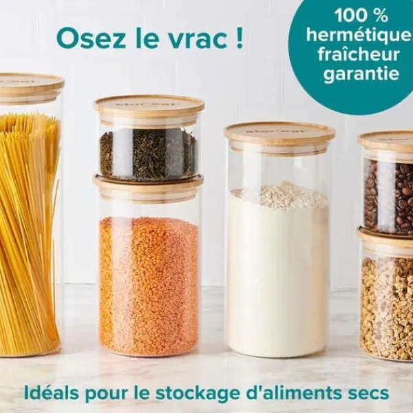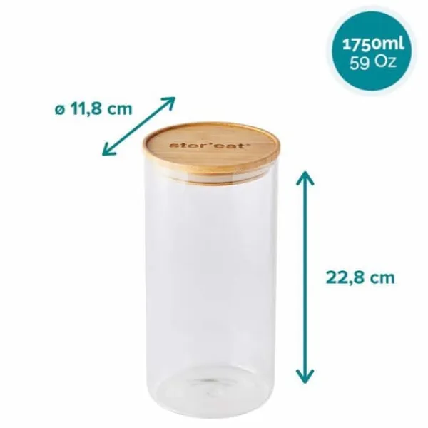 KONSERVERING ANSLUTEN: Bevara alla dina inköp av torra livsmedel i bulk med denna anslutna burk på 1750 ml. De kommer att behålla sin färskhet tack vare dess täta lock! Mycket hållbar glasstruktur och garanterat utan bisfenol A. ÄSTETISK DESIGN: Locket i bambu på denna burk är fullt av elegans och glansen av glaset gör att du enkelt kan identifiera innehållet i ditt skåp. ENKEL FÖRVARING: Locket med kant på denna förvaringsburk gör att den enkelt kan ställas ovanpå andra burkar. Säg adjö till röran på dina hyllor! STOPPA MATSPILL: Anslut till appen Stor’eat med den medföljande QR-koden och få en översikt över all information om livsmedelsförvaring som finns i burken, samt receptidéer för att använda livsmedel som når utgångsdatum! MASTRAD, ETT FRANSKT FÖRETAG: I över 25 år har det franska företaget Mastrad designat innovativa köksaccessoarer med kreativ design, för nöje hos matlagningsentusiaster och yrkesverksamma. Produktmått: 11,8 x 11,8 x 22,8 cm; 540 gram. Tillverkare: Mastrad. Modellnummer: F93783 – modell: F93783. Optimerad för sökmotorer på marknadsplatser: Håll dina torra livsmedel i bulk färska längre med denna anslutna burk på 1750 ml. Dess eleganta design i transparent glas och bambu möjliggör enkel förvaring på dina hyllor. Anslut till appen Stor’eat för att få information om livsmedelsförvaring och receptidéer för att undvika matsvinn. Designad av det franska företaget Mastrad, en innovativ köksaccessoar för matlagningsentusiaster.