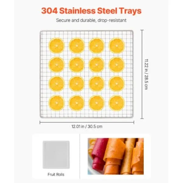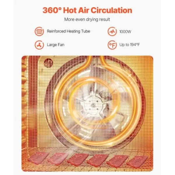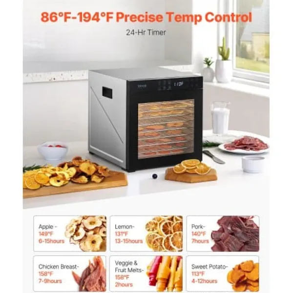 Denna matdehydrator erbjuder effektiv och jämn torkning av olika livsmedel, bevarar näringsämnen och gör det möjligt för dig att tillverka jerky, torkad frukt, grönsaker, örter och husdjursgodis hemma. Med stor kapacitet och användarvänliga digitala kontroller är den utformad för bekvämlighet, hållbarhet och enkel rengöring. Det synliga fönstret och tysta driften gör det enkelt och bekymmersfritt att övervaka torkningsprocessen.