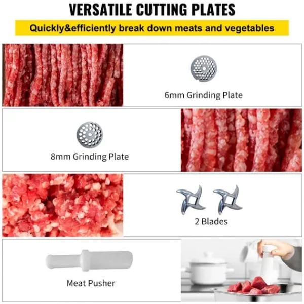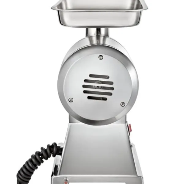 I den medföljande köttskålen kan du förvara köttbitarna för enkel åtkomst under malningen. Den medföljande köttstötaren gör det enkelt att mata in köttet. Två malplattor (6 mm, 8 mm) ingår också. 6 mm malplattan är monterad på maskinen, och vi erbjuder även en 8 mm malplatta för grov eller fin malning. Spänning: 220 V / 50 Hz; motorstyrka: 850 W, 250 kg / 550 lbs kött per timme, 225 RPM skärhastighet.