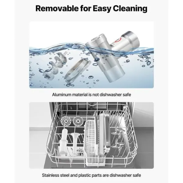 Med avtagbara delar som enkelt kan tas bort för rengöring med vatten, är denna köttkvarn både praktisk och hygienisk. Se till att låta delarna torka ordentligt innan förvaring för att bibehålla dess kvalitet över tid.