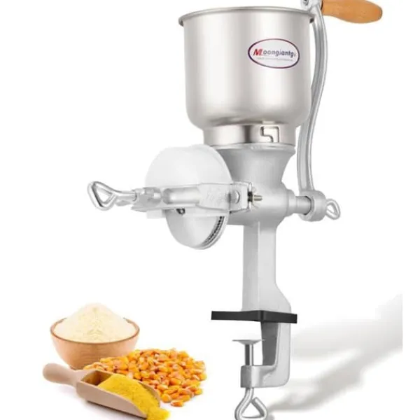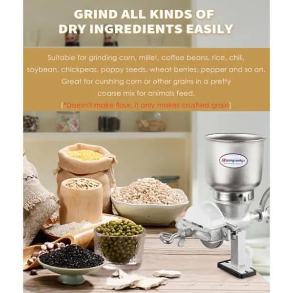 Denna manuella kornkvarn på 13 cm är idealisk för att mala olika korn som majs, kaffe och ris. Med sin justerbara malningsgrad kan den anpassa texturen efter dina behov. Tillverkad av gjutjärn är den utformad för enkel användning tack vare sin vev. Observera att den inte är lämplig för fuktiga korn.
