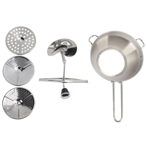 Denna manuella matkvarn är designad för att göra dina matberedningsuppgifter enklare och effektivare. Den levereras med 3 utbytbara slipplattor i rostfritt stål som gör att du kan tillaga fin-, medel- och grovkornig mat. Den tunna tallriken är perfekt för gelé, barnmat och sås, mellanplattan för äppelmos och grönsakssoppa och den tjocka tallriken för tjock sås och potatismos.