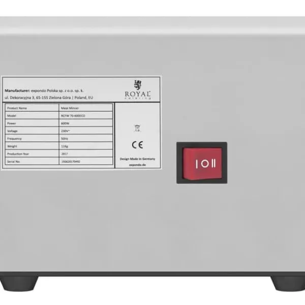 Royal Catering köttkvarn är perfekt för både professionell catering och hemmabruk. Modellen RCFW 70-600ECO kan även användas för att mala andra livsmedelsprodukter. Utrustningen har en effekt på 600 W och en kapacitet på 70 kg/h. Maskinen är utrustad med en trestegsknopp som gör att du kan slå på eller av slipningen och dra in skruven. Den rymliga brickan gör att du kan förbereda stora portioner samtidigt. Höljet och elementen som kommer i kontakt med livsmedel är tillverkade av högkvalitativt rostfritt stål, resistenta mot korrosion, permanent smuts och mekaniska skador. Det är också helt säkert för hälsan eftersom det är biologiskt neutralt. Speciella hål säkerställer effektiv motorkylning och gummifötter ger stabilitet och stötdämpning. I setet ingår även två silar med maskdiametrar på 5 och 7 mm.