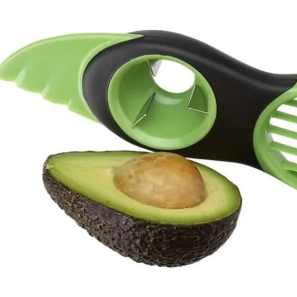 Köksredskap Fruktpitter 3-i-1 avokadoskärare Grön delar Gropar Skivor Storlek: 19,5 cm x 6 cm (ca, L x B, 7,61 x 2,34 tum) Delar: Tandat blad, skär lätt plastadvokater i två delar; bladet räcker