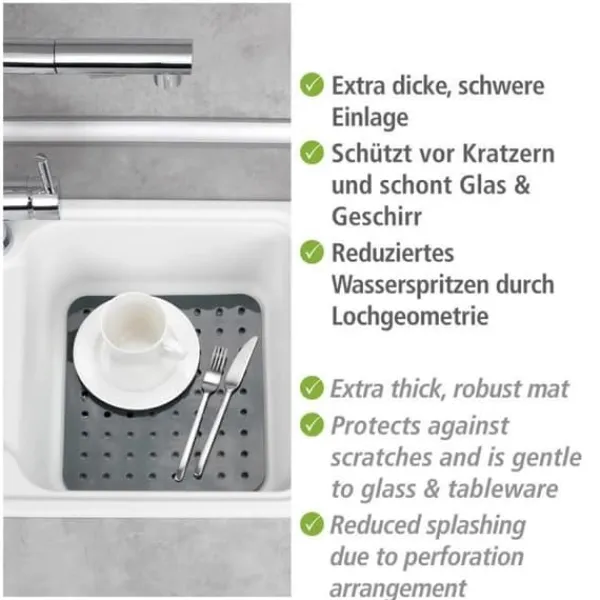 Kristall diskmatta från WENKO är en extra tjock och tung tvättmatta som skyddar diskhon mot repor. Den skyddar också effektivt glas och bestick. Tack vare den speciella geometrin hos hålen minskas stänk av vatten kraftigt vid vattenflödet. De stora avloppshålen gör att tvättvattnet lätt kan rinna av igen.