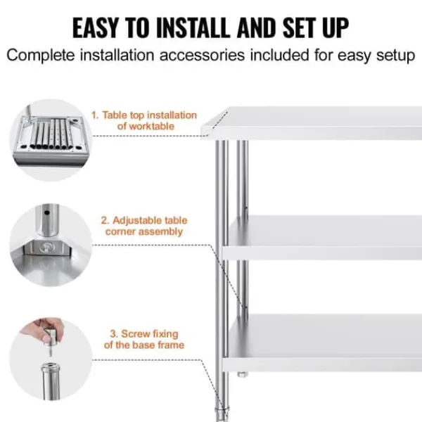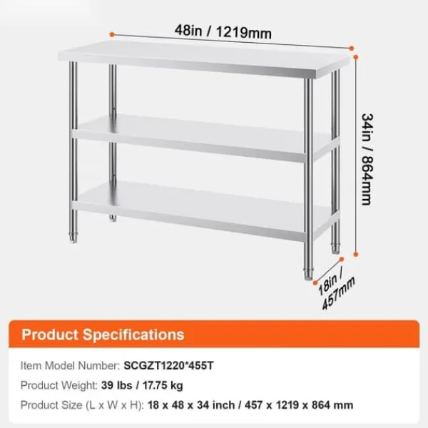 För din säkerhet krävs handskar vid montering. Detta arbetsbord, som mäter 18 x 48 x 34 tum, är tillverkat av SUS201 rostfritt stål för bordsskiva, hyllor och ben. Den erbjuder överlägsen rostbeständighet, ett elegant utseende och en slät yta som är lätt att rengöra med en enkel avtorkning. NSF-certifierad, den uppfyller stränga folkhälsostandarder, vilket säkerställer långvarigt skydd för din hälsa.
