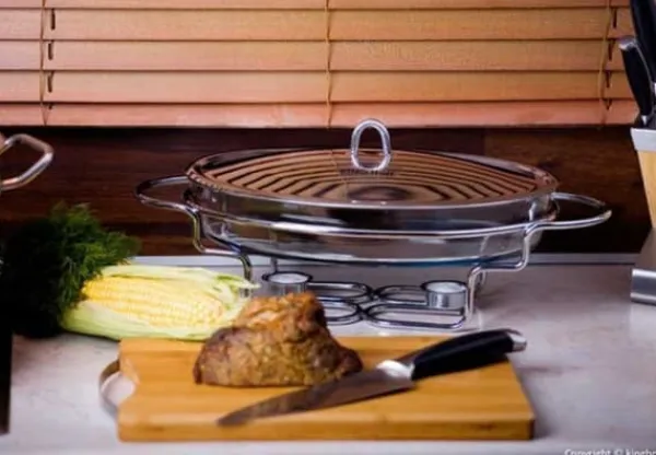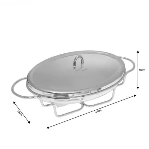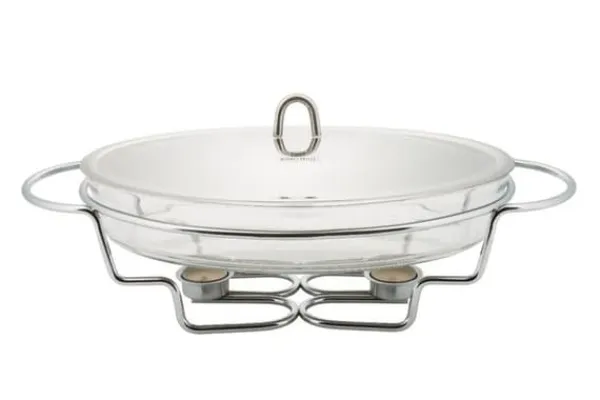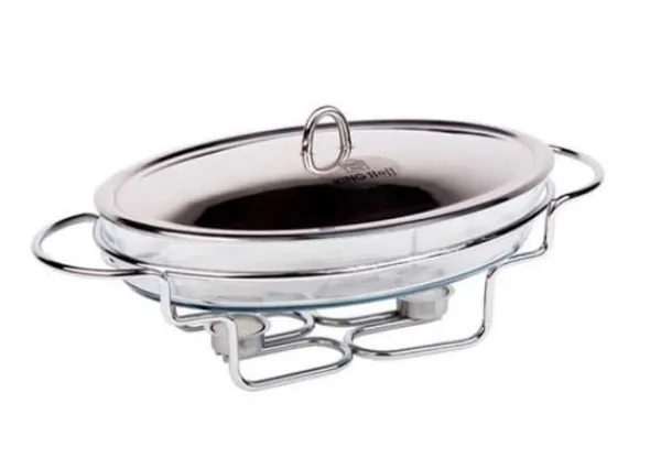 Du kan ställa formen direkt från ugnen på bordet i en elegant ugnssäker form med lock. Tack vare 2 värmeljusvärmare kommer maten att vara varm hela tiden och du kan ägna din tid åt dina gäster. Kärlet är tillverkat av värmebeständigt glas (PYREX Glasmatvärmare). Överdrag av högkvalitativt rostfritt stål. Glasinsats i metallfot. Två ljus som värmer mat. Lämplig för disk i diskmaskin. Glasinsatsen kan användas i mikrovågsugnar Mått: Kapacitet: 3,2 L Längd: 45 cm Höjd: 20 cm Höjd utan lock: 13 cm Bredd: 25 cm.