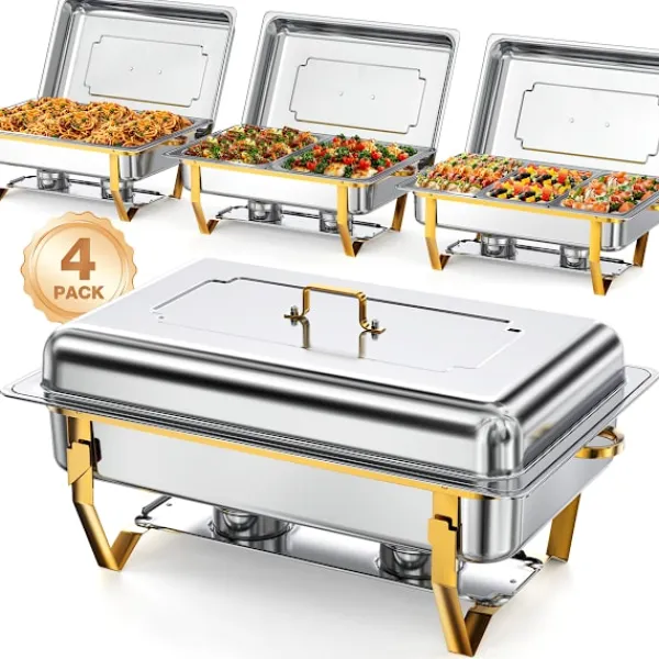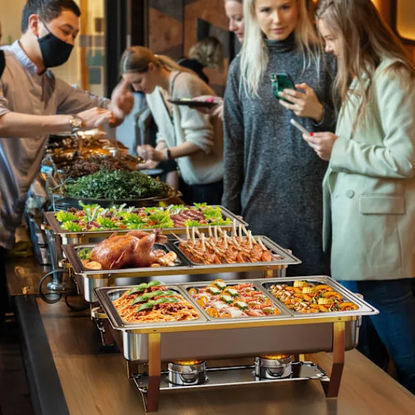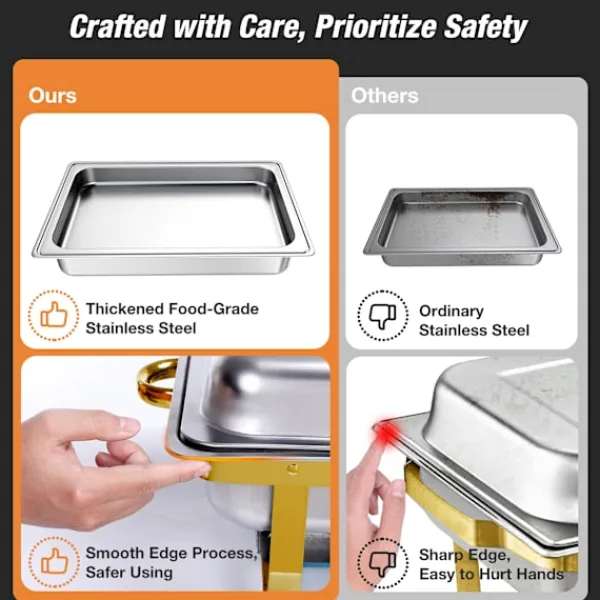 Varmhållningsfat-buffésetet är tillverkat av kraftigt, livsmedelsklassat rostfritt stål som motstår rost, bucklor och slitage för långvarig användning. De rullade kanterna på varmhållningsskålarna i rostfritt stål erbjuder säker hantering och hjälper till att förhindra oavsiktliga skärskador under uppställning eller service.