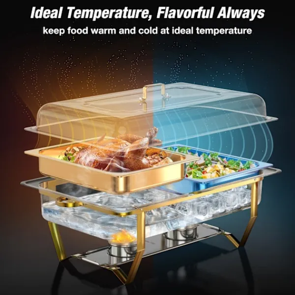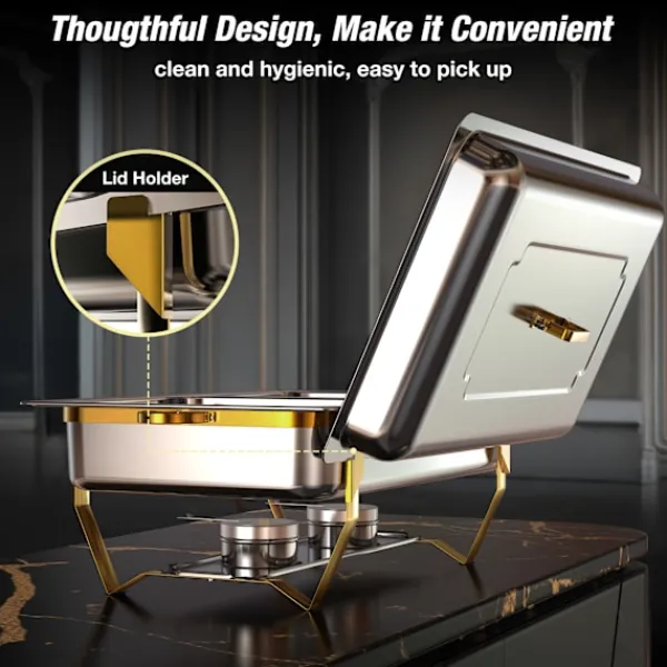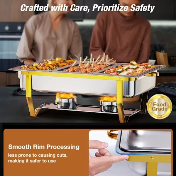 Den spegelblanka ytan i rostfritt stål på de guldfärgade varmhållningsskålarna och buffévärmarseten motstår mat som fastnar och är lätta att torka av. Spara tid efter evenemang – diska bara eller diska i diskmaskinen för enkelt underhåll