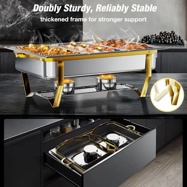 Dessa rektangulära varmhållningsskålar för buffé är byggda med en förtjockad, hopfällbar ram och erbjuder förbättrat stöd och stabilitet för tyngre mat. Den hopfällbara designen gör förvaring och transport enklare för mobil catering inomhus och utomhus, fester och trånga kök.
