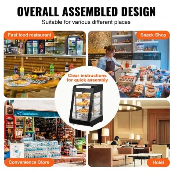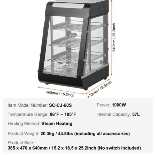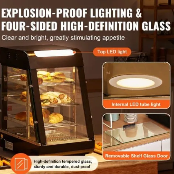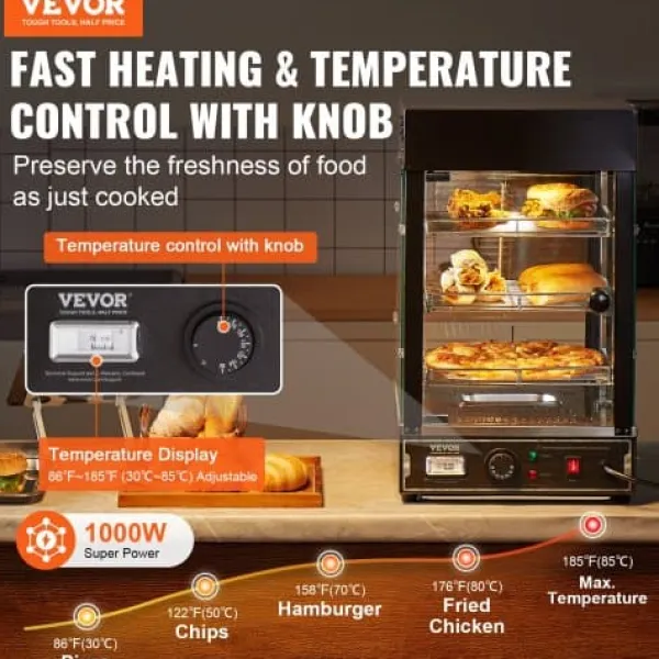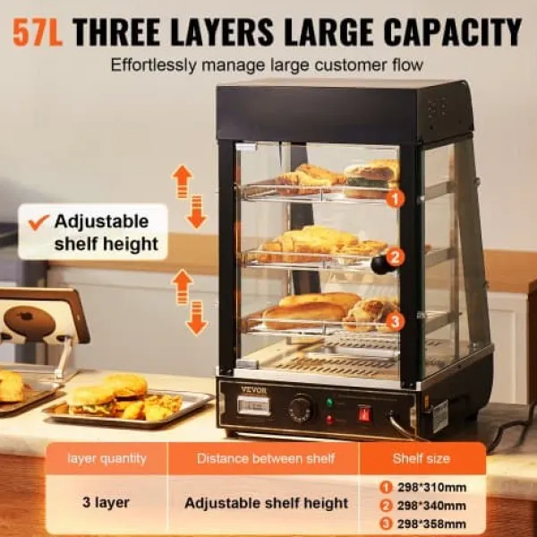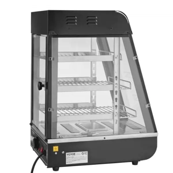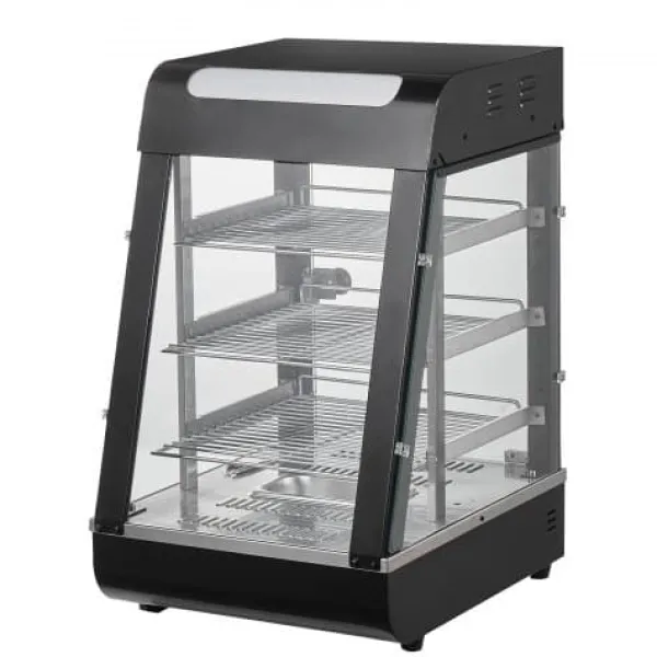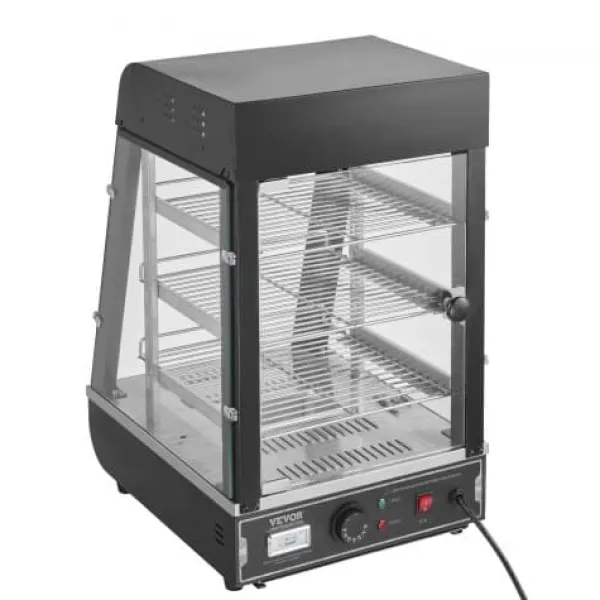 Detta 3-vånings kommersiella matvärmeskåp är utformat för att hålla en mängd olika livsmedel såsom hamburgare, pizza, bröd och friterad kyckling vid optimal temperatur samtidigt som de visas upp på ett attraktivt sätt. Med justerbara hyllor, en temperaturregulator med realtidsvisning och ånguppvärmning för fuktbevarande säkerställer den att din mat förblir färsk och läcker längre. Den robusta konstruktionen i rostfritt stål och härdat glas ger hållbarhet och tydlig synlighet, vilket gör den idealisk för bagerier, kaféer och närbutiker.