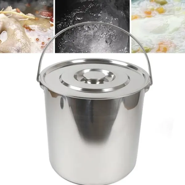 Robust rostfri hink 20 L med lockEn kraftig hink i rostfritt stål för kök, gastronomi, industri, medicin och hemmabruk. Med cirka 1 mm godstjocklek, stor volym och tätt lock är den perfekt för förvaring, transport och användning med hett vatten.