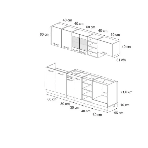 DIMENSIONER: Köksblocket har en generell storlek på 240 cm, djupet och höjden på de nedre och övre modulerna visas på bilderna.