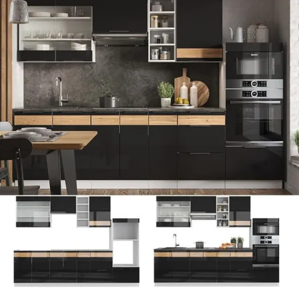 Fame-Line köksskåp erbjuder förstklassig kvalitet med starka metallhandtag, bekväma mjukstängande gångjärn och full-extension metallskivor till rimliga priser. Med ”Fame-Line” välj mellan färdiga kökskoncept eller utöka dem som du vill med ytterligare moduler. DIMENSIONER: Köksblocket har en generell storlek på 280 cm, djupet och höjden på de nedre och övre modulerna visas på bilderna. MATERIAL: Det modulära pentryt tillverkat av lättskött 16 mm spånskiva, med melaminhartsbeläggning. Alla fronter på köksenheterna är gjorda av högkvalitativ MDF. LEVERANSINNEHÅLL: Köksdel utan bänkskiva, monteringsmaterial, monteringsanvisning (om inget annat anges ingår inte hushållsapparater och dekorationer i leveransen)