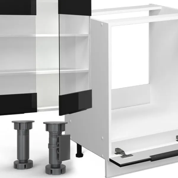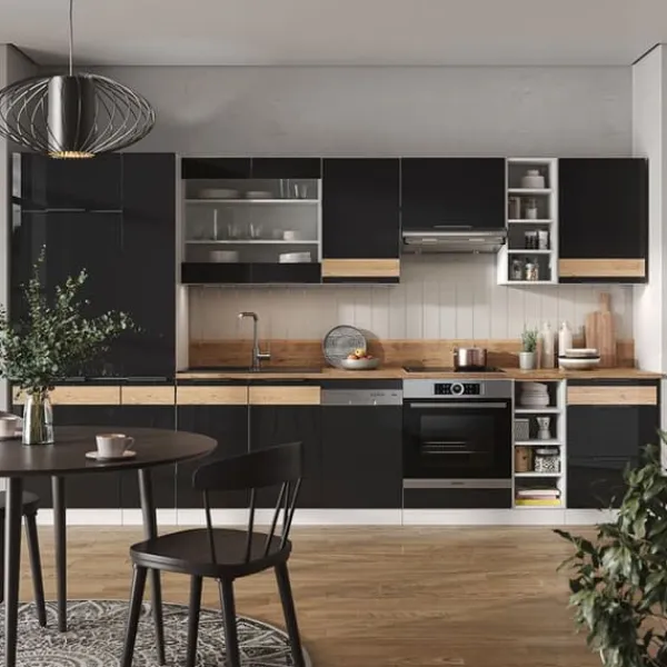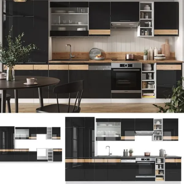 Fame-Line köksskåp erbjuder förstklassig kvalitet med starka metallhandtag, bekväma mjukstängande gångjärn och full-extension metallskivor till rimliga priser. Med ”Fame-Line” välj mellan färdiga kökskoncept eller utöka dem som du vill med ytterligare moduler. DIMENSIONER: Köksblocket har en generell storlek på 355 cm, djupet och höjden på de nedre och övre modulerna visas på bilderna. MATERIAL: Det modulära pentryt tillverkat av lättskött 16 mm spånskiva, med melaminhartsbeläggning. Alla fronter på köksenheterna är gjorda av högkvalitativ MDF. LEVERANSINNEHÅLL: Köksdel utan bänkskiva, monteringsmaterial, monteringsanvisning (om inget annat anges ingår inte hushållsapparater och dekorationer i leveransen)