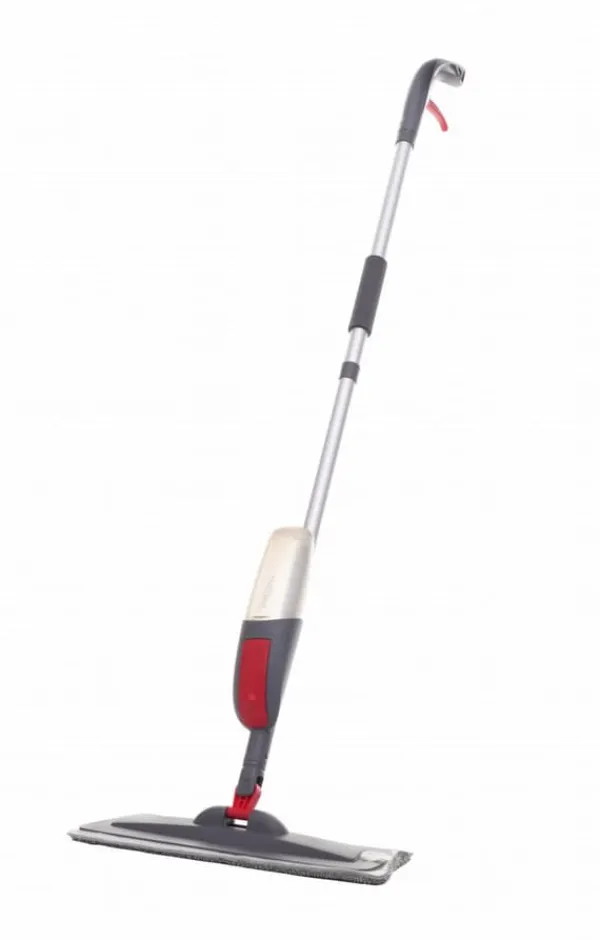 För att starta sprutan, tryck bara på knappen på handtaget. Vätskan komprimeras av en speciell pump, vilket skapar en bred dimma som täcker området framför moppen. Den är tillverkad av högkvalitativ plast och rostfritt stål.