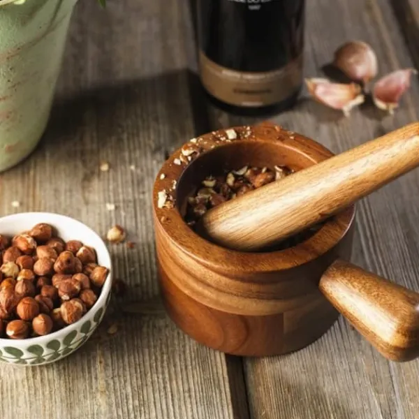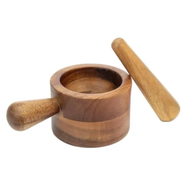 En perfekt mortel i acaciaträ från Tina. Praktisk tack vare sitt handtag på sidan som gör att man får ett stadigt grepp samtidigt som den är tillräckligt djup för att kunna stöta och jobba på ordentligt.