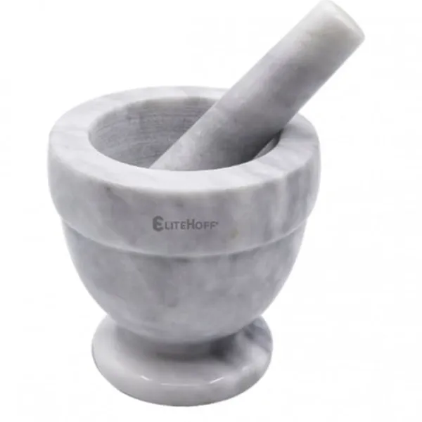 Kärl med mortelstöt för manuell malning och malning av olika ämnen. Du kan krossa en liten mängd av ämnet genom att gnugga det med en mortelstöt över skålens lite grova yta. Skålarna och mortelstöten är gjorda av granit. I den presenterade morteln får du en exakt pulveriserad substans utan klumpar. Produktegenskaper: – Handgjorda av ett block av hård marmor – Mycket hållbart, kommer inte att slitas ut eller spricka, oavsett styrkan på slipningen – Tack vare den polerade finishen på utsidan av murbruket och tamperen kommer det att bli en estetisk dekoration av alla kök – Sabotagestorlek: 12 cm – Murbruksstorlek: Ø10 x 10 cm – Material: naturlig marmor