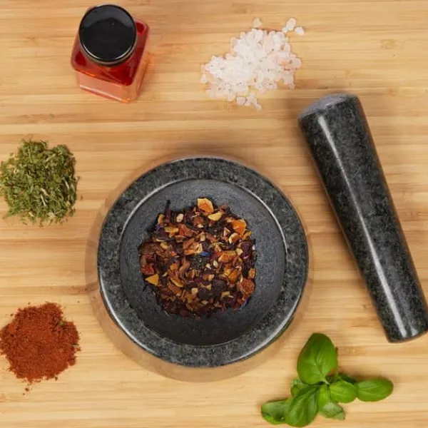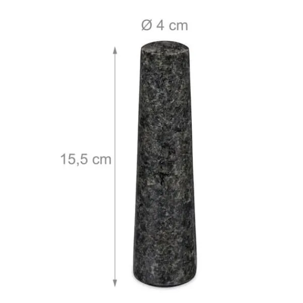 Hanterbar kryddmortel för köket. Med detta mortel- och pistilset kan du enkelt och snabbt förbereda dina peston och andra blandningar. Morteln för örter och pistilen är tillverkade av massiv granit. Den naturliga stenen med lång livslängd imponerar inte bara med sin vackra mörkgrå marmorering, utan också med sin chockbeständighet. De grova ytorna maler alla kryddor. Dessa svämmar inte över tack vare dörrens djup. Tack vare den polerade ytan är rengöringen av morteln enkel med vatten. Notera: Skölj före första användning med vatten och om nödvändigt med lite grovt salt för att ta bort rester från tillverkningen.