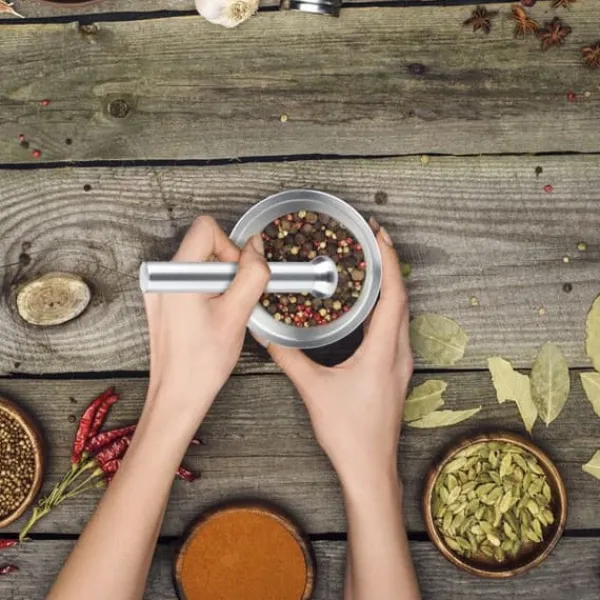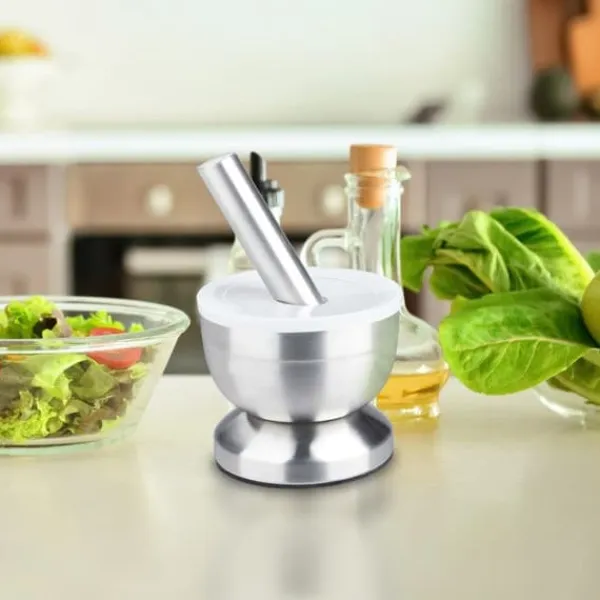 Denna mångsidiga mortel levereras med en matchande stöt och är den perfekta krossaren för köket. Krossa örter och kryddor eller förbered pestos och kryddiga chutneys. Den halkfria kryddmorteln förblir stabil under krossning eller stomping på bänkskivan. Det praktiska locket förhindrar spill under förberedelsen. Dessutom är morteln också användbar inom medicin, till exempel för att krossa tabletter.