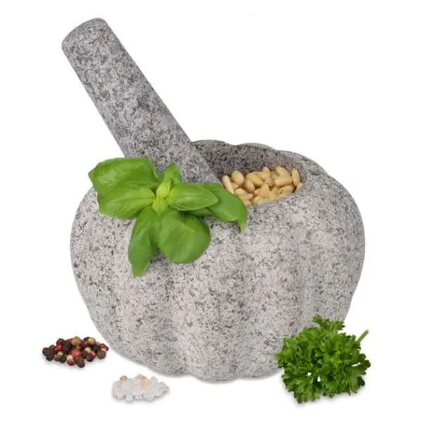 Granitmortel för kök med dekorativ design Oavsett om det är basilikapesto, currypasta eller guacamole, tillaga läckra såser och dippsåser med denna stenmortel. Malning av örter och kryddor frigör varsamt deras aromer, vilket resulterar i en mer intensiv smak. Den opolerade morteln och stöten säkerställer särskilt effektiva malningsresultat. Örtmorteln är tillverkad av massiv granit, en hållbar och robust natursten.