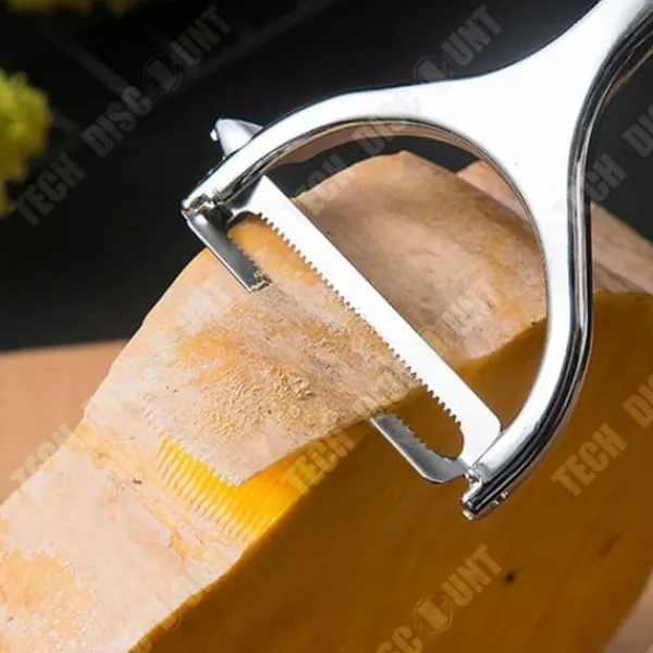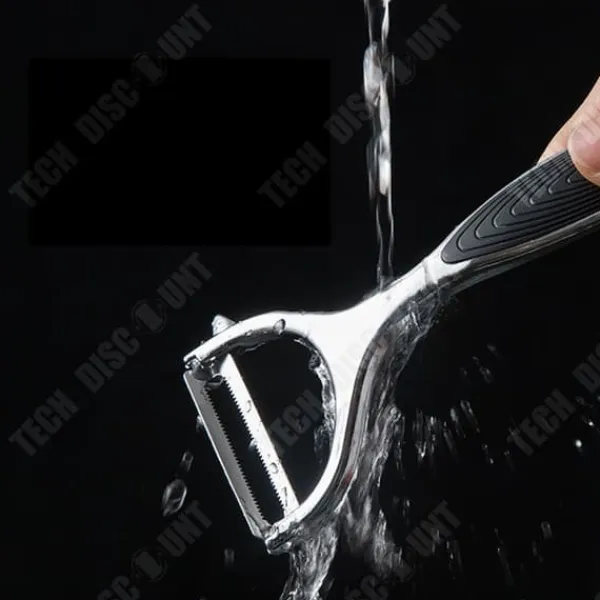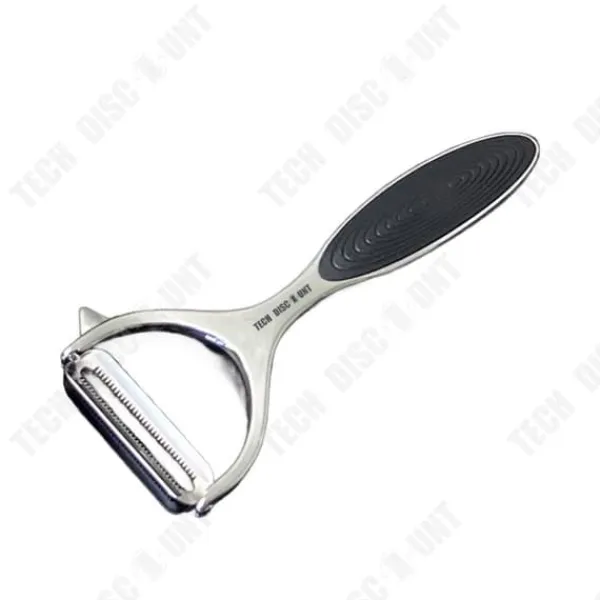 Upptäck vår multifunktionella skalare TECH DISCOUNT, i rostfritt stål och zinklegering. Med sitt vassa blad och ergonomiska handtag underlättar den skalning av frukter och grönsaker. Diskmaskin säker, den är lätt att rengöra och hållbar. Ett praktiskt och elegant verktyg för ditt kök, perfekt som gåva.