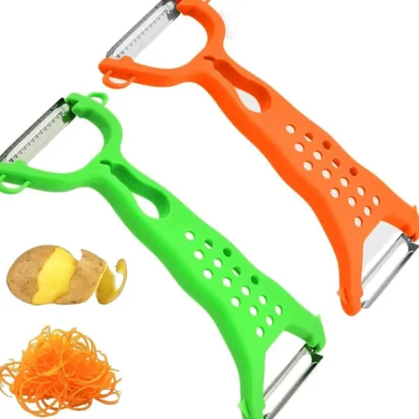Detta 2-i-1 skalset kombinerar två bladtyper – ett rakt och ett räfflat – vilket gör det enkelt att både skala och strimla frukt och grönsaker. Du kan justera tjockleken genom att ändra trycket med handen, för perfekta resultat varje gång.