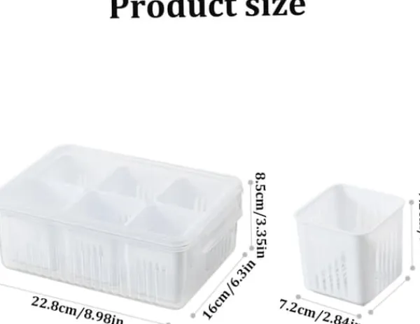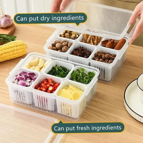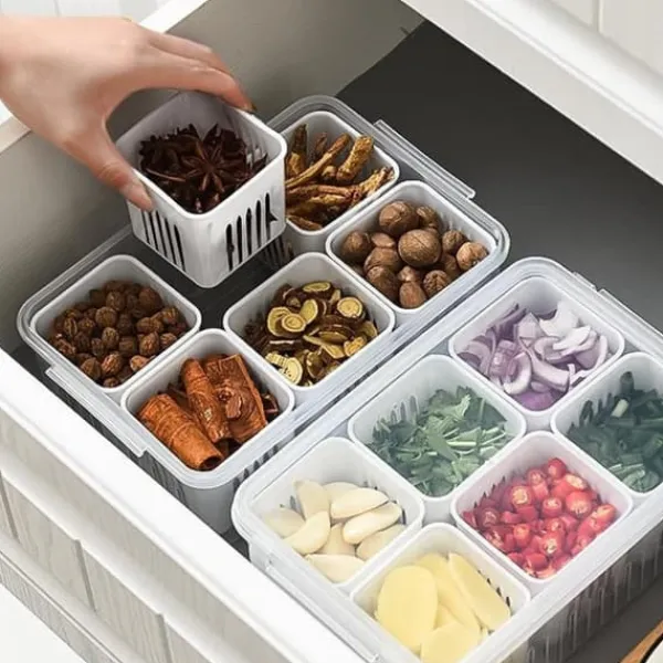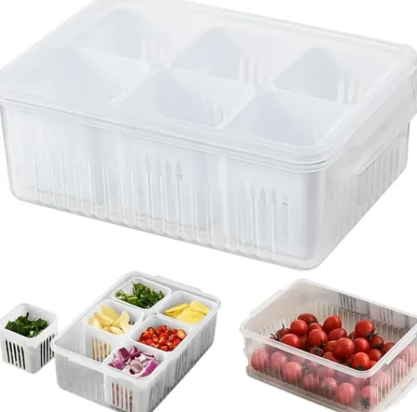 Vår 6-i-1-förvaringslåda för köket är den perfekta lösningen för att sortera och organisera din mat! Med sex små fack kan du enkelt dela upp måltider och snacks efter behov. Varje fack är dessutom utrustat med dräneringsfunktion som håller maten fräsch och smakrik.