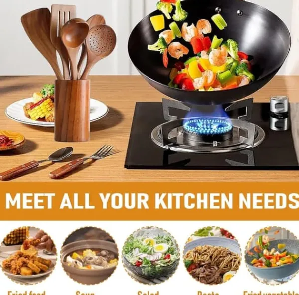 Tillverkat av naturligt massivt teakträ, känt för sin höga täthet, hårdhet och motståndskraft mot sprickor. Teak är mer hållbart än bambu eller silikon. Alla redskap är handslipade för en slät yta som inte skadar dina kastruller eller stekpannor.