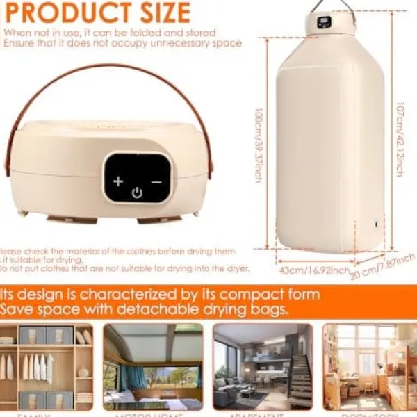 Storlek: 41 x 18 x 102 cm (L x B x H utan bärhandtag), den nedre torkpåsen mäter cirka 91 cm hög. Torktumlaren är en platsbesparande, platt och bärbar torktumlare som ger bekvämlighet och effektivitet till ditt bostadsutrymme. Den är utformad för att spara utrymme med sin kompakta form och avtagbara torkpåse. När den inte används kan den vikas och förvaras för att säkerställa att den inte tar upp onödigt utrymme. Den är idealisk för hem, husvagnar, lägenheter och studentbostäder.
