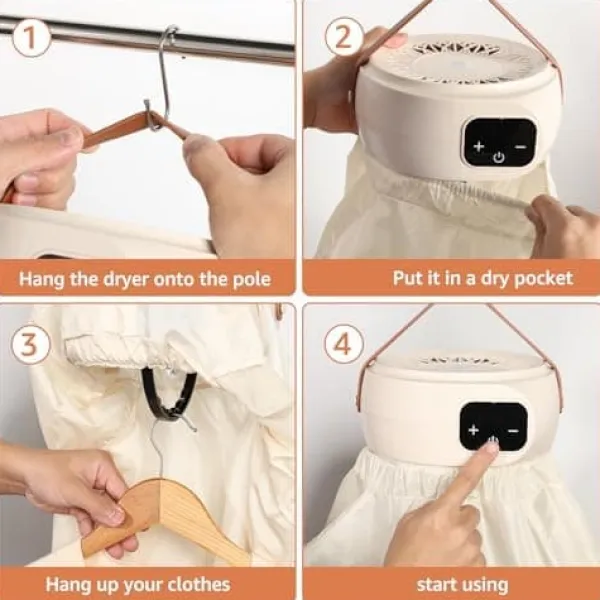 Snabbtorkning: Den kompakta torktumlaren kan enkelt styras och ställas in med den digitala LED-displayen och smarta touch-inställningarna. Häng bara torktumlaren på en stång och använd den. Minitorktumlaren har en förinställd torktid markerad på maskinen. Du kan välja önskad torktid och använda timerknappen för att justera inställningen så att den matchar dina specifika torkpreferenser.