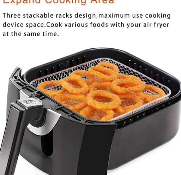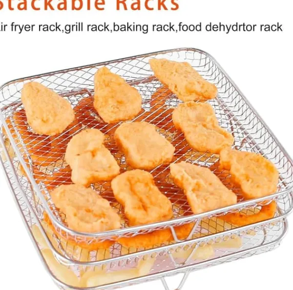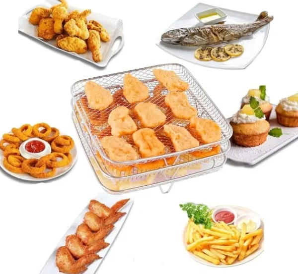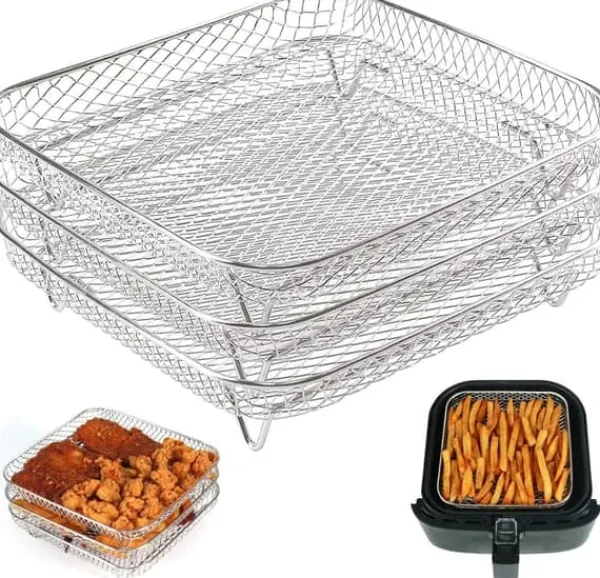 Detta tre lager grillställ är tillverkat av högkvalitativt 304 rostfritt stål, vilket gör det hållbart, rostbeständigt och värmebeständigt. Det är designat för att passa många olika luftfritöser och ugnar. Med sina tre lager kan du tillaga flera typer av mat samtidigt, medan överskott av fett avlägsnas för en hälsosammare tillagning. Det är enkelt att rengöra och har en effektiv luftcirkulation för jämn uppvärmning.