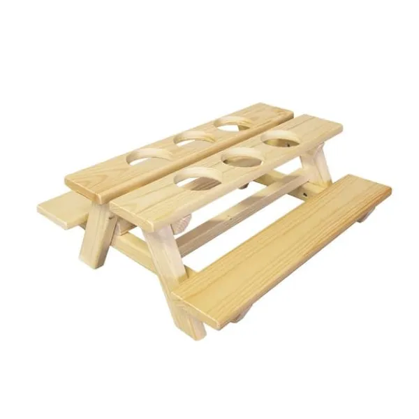 Flaskhållaren rymmer 6 flaskor. Trähållaren är lätt och enkel att bära. Flaskhållarens picknickbord mäter 39x37x16,5 cm.