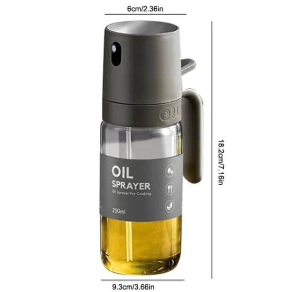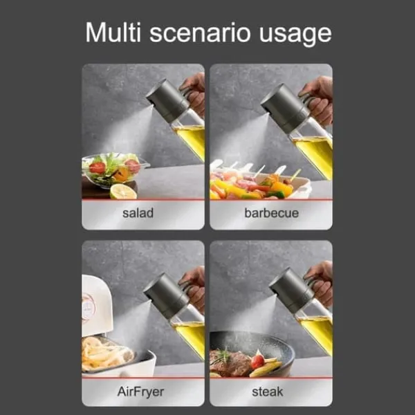 1.Materialer: Tillverkad av en kombination av PP, ABS, rostfritt stål, högt borosilikatglas och silikon, är vår olje sprayflaska utformad för lätt underhåll och hållbarhet.