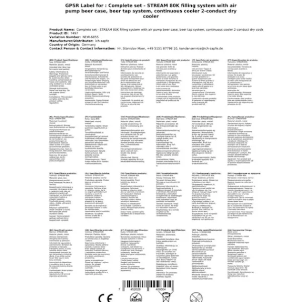 Komplett set – Öltapp STREAM 80K med luftpump, ölväska, genomströmningskylare, 2-linjers torrkylare Består av: •STREAM 80K med luftpump, ölväska, genomströmningskylare, 2-linjers torrkylare•2x tryckluftsslang komplett John Guest 5/16 till 3/4 skruva på för att skruva på dispenseringshuvudena•2x ölslang komplett John Guest 3/8 till 5/8 skruva på för att skruva på kranhuvudena•2x kranhuvuden efter eget val (utan kranhuvuden, 5 liters adapter, platt, kombi, Köpi, triangulär, korg)•Anslutningar: John Guest Öltapp STREAM 80K med luftpump, ölväska, genomströmningskylare, 2-linjers torrkylare Öltapp STREAM 80K med luftpump, ölväska, genomströmningskylare, 2-linjers torrkylare 3 minuter att packa upp… 2 minuter att montera… 1 minut att ansluta = oändlig njutning.En kall, klar, nyutkastad – du förtjänar det!Ölkylaren STREAM 80K 2lt är avsedd för professionell kylning och utskänkningav utmärkt kyld öl i hemmamiljö, på trädgårdsfesteroch för medelstora kommersiella användningsområden. •Reglerområde+2 till +10 grader•Effekt:90 liter/timme vid 10°C TD•Kylteknologiär 45% mer effektiv•Klar att användapå bara 5-10 minuter När termostaten är inställd på Max,kommer termoblocket (efter ca 10 minuter) att ackumulera en hög mängdenergi och möjliggöra därmed en utskänkning avflera kylda öl i följd.Kylteknologin i STREAM 80K Öltapp är cirka 45% mer effektiv än den elektriska effektförbrukningen.Ölet kyls ned till tappkranen.Kylöglorna är tillverkade av rostfritt stål och är därför stabila och hållbara. De använda materialen uppfyller de högsta hygienstandarderna och möjliggör lång livslängd för kylaren. STREAM 80K 2lt – och den kalla ölen strömmar från 2 kranar Med sin starka kyleffekt och perfekta dimensioner är Öltapp STREAM 80K en av de ledande 2-linjers bord-/underbänkskylarna på marknaden. Kyleffekt på 170 till 180 glas (0,5 liter) utmärkt kylt öl per timme, Den kraftfulla kompressorn STREAM 80K säkerställer minimal energiförbrukning och utmärkt kylt öl utan skumning Genomlopps-/torrkylare STREAM 80K 2ltg. – Effektivitet, Effekt, Njutning Termoblocket i STREAM 80K ölzapfanläggning har hög energikapacitet, vilket gör att perfekt kyld öl kan tappas redan efter 5-10 minuter. När termostaten är inställd på Max, kommer termoblocket (efter ca 10 minuter) att ackumulera en hög mängd energi och möjliggöra därmed en utskänkning av flera kylda öl i följd. Kylteknologin i STREAM 80K Öltapp är cirka 45% mer effektiv än den elektriska effektförbrukningen. Ölet kyls ned till tappkranen. Kylöglorna är tillverkade av rostfritt stål och är därför stabila och hållbara. De använda materialen uppfyller de högsta hygienstandarderna och möjliggör lång livslängd för kylaren. Genomlopps-/torrkylare STREAM 80K – Tekniska Data Den ädla STREAM 80K Torrkylaren med en vikt på endast 45 kg är utrustad med ett 7 mm rör. •Mått: (BxDxH) 255x635x510 mm (inkl. droppskål)•Strömförsörjning: 220V, 50 Hz, 804W, 4,5A•Kompressor: 3/8 PS•Rörledning: 2 sorters öl•Hölje: Metall, pulverlackerad, rostskydd Hög kvalitet på utförande och förpackning STREAM 80K – Bäst i klassen för 2-linjers Öltapp Ölkylaren STREAM 80K är i kategorin Öltapp upp till 90 liter/timme, en av de bästa när det gäller kostnads-, prestanda- och kvalitetsförhållandet. Enkel rengöring av STREAM 80K Med följande rengöringsset kan du enkelt och bekvämt rengöra din STREAM 80K Öltapp efter användning: Rengöringsset litet Lättrengöringsset (rekommenderas) Städningsset stort Öltapp STREAM 80K – 2 linjer, upp till 90 liter/timme Med bara några enkla steg kan du tappa: Packa upp Öltapp Anslut tryckregulatorn till CO2-flaskan med koldioxidnyckeln och dra åt Anslut CO2-slangen från tryckregulatorn till tapphuvudet Anslut ölslangen till tapphuvudet, sätt in den i zapfanläggningen och fixera den Anslut öltunnan Ställ in trycket på tryckregulatorn Anslut zapfanläggningen till eluttaget Ställ in trycket och njut av kall öl