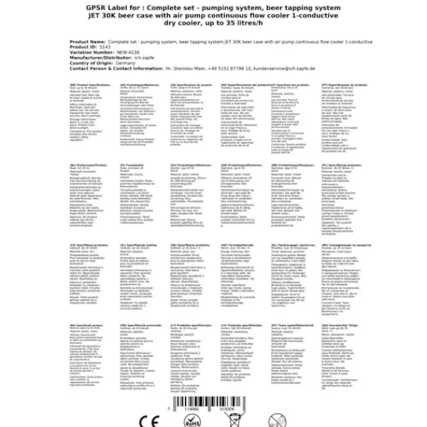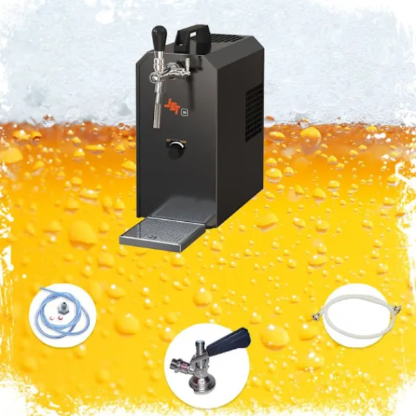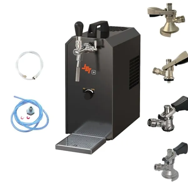 Komplett uppsättning – Öltapp, öldispenser, ölmaskin, ölautomat, ölkylare, öltappingssystem – JET 30K dispenser med luftpump en linje torr kylare, 30 liter/h Består av: •JET 30K öllåda med luftpump flödeskylare 1-rads torrkylare, upp till 35 liter/h•1x tryckluftsslang komplett John Guest 5/ 16 till 3/4 ;Skruva på för att skruva på kranhuvudena•1x ölslang komplett John Guest 3/8 till 5/8 Skruva på för att skruva på kranhuvudena•1x kranhuvud valfritt (utan kranhuvud, 5 liters adapter, platt, kombination, Köpi, triangulär, korg) Öltapp – JET 30K dispenser med luftpump en linje torr kylare, 30 liter/h Öltapp – JET 30K dispenser med luftpump en linje torr kylare, 30 liter/hÖlbox, Genomströmningskylare, Torrkylare 3 minuter att packa upp… 2 minuter att ställa upp… 1 minut att ansluta = oändligNjutning utan CO2 En kall, klar, nyligen tappad öl – du har förtjänat det! Ölkylaren JET 30K är avsedd för professionell kylning och servering av utmärkt kyld öl, utan användning av CO2 tack vare integrerad luftpump för tryckproduktion. Avsedd för användning hemma, på trädgårdsfester och för små kommersiella ändamål. •Reglerområde+2 till +10 grader•Effekt:30 liter/timme vid 10°C TD•Kylteknologiär 45% mer effektiv•Klar att användapå endast 2-4 minuter Om termostaten ställs in på max kommer termoblocket (efter cirka 10 minuter) ackumulera en hög mängd energi och möjliggöra servering av flera kylda öl i följd.Kyltekniken i JET 30K-dispensern är cirka 45 % effektivare än den elektriska strömförbrukningen.Ölet kyls ner till kranen.Kylslingorna är tillverkade av rostfritt stål och är därför stabila och hållbara. De använda materialen uppfyller de högsta hygienstandarderna och möjliggör lång livslängd för kylaren. JET 30K – Stark och snabb som en jet Med sin kraftfulla kylprestanda och perfekta dimensioner är Öltapp JET 30K en av de ledande bords-/undervåningskylarna på marknaden. Kylprestanda från 40 till 60 glas (0,5 liter) utmärkt kyld öl per timme, Den kraftfulla kompressorn JET 30K säkerställer minimal energiförbrukning och utmärkt kyld öl utan att skumma och utan CO2-flaska. Genomströmningskylare JET 30K – Effektivitet, Prestanda, Njutning Termoblocket för JET 30K Öltapp har hög energikapacitet, vilket möjliggör servering av perfekt kyld öl på endast 2-4 minuter. Om termostaten ställs in på max kommer termoblocket (efter cirka 10 minuter) ackumulera en hög mängd energi och möjliggöra servering av flera kylda öl i följd. Kyltekniken i JET 30K-dispensern är cirka 45 % effektivare än den elektriska strömförbrukningen.Ölet kyls ner till kranen.Ingen CO2 används – integrerad luftpump säkerställer problemfri och mobil tappningKylslingorna är tillverkade av rostfritt stål och är därför stabila och hållbara JET 30K Genomströmningskylare – Tekniska data Den ädla JET 30K torrkylaren med en vikt av endast 14,5 kg är utrustad med en 7 mm ledning. •Mått: B/D/H/ 167/281 / (inklusive droppskål) / 368 mm•Spänning: 230V, 50 Hz, 267W, 1,16A•Kompressor: 1/8 hk•Ledning: 1 x Öl•Hölje: Metall, pulverlackerat, rostsäkert Hög kvalitet på utförande och förpackning JET 30K – Bäst i sin klass Bierkühler JET 30K är i kategorin Dispenseringssystem upp till 30 l/h en av de bästa när det gäller kostnads-,prestanda- och kvalitetsförhållandet. Enkel rengöring av JET 30K-anläggningen Med följande rengöringsset kan du enkelt och bekvämt rengöra Öltapp JET 30K efter användning: Rengöringsset litet Lättrengöringsset (rekommenderas) Städningsset stort Bierkühler JET 30K – Enkel att använda – Topprestanda I några enkla steg tappas ölet: Packa upp Dispenseringssystem Anslut luftslangen till tapphuvudet Anslut ölslangen till tapphuvudet, sätt in den i Dispenseringssystem och fixera den Punktborra ölfatet Anslut kransystem till eluttaget Justera trycket och njut av kall öl Alla komponenter finns i komplettsetet eller som tillbehör i vår butik