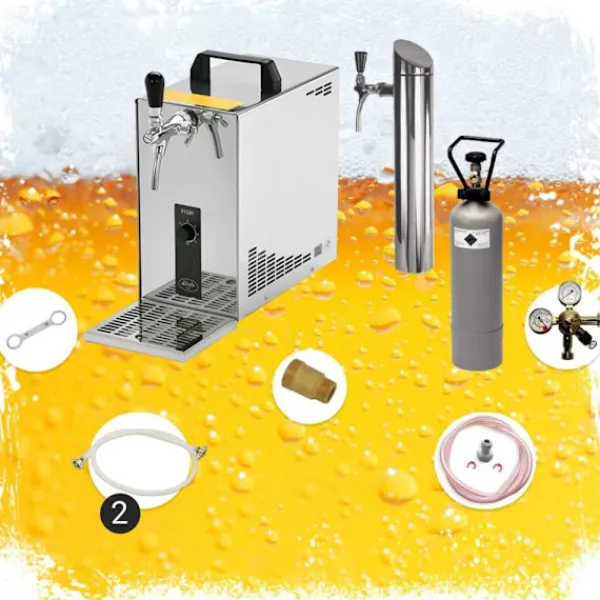 Underräknare komplett set Öltapp, öldispenser, ölmaskin, ölautomat, ölkylare, öltappingssystem PYGMY 25 LE, 1-sidigt torrkylare, 30 liter / h, inkl dispenser, Green Line Avtappningskapacitet: 30 L / h vid 10 ° C TD Redo att användas på bara 2-4 minuter Torrkylningssystem 1-sidigt Lätt torr kylkran i rostfritt stål Kyltekniken är 45% effektivare Grön linje – miljövänlig Består: •PYGMY 25 LE öldispenser 1-sidig torrkylningsenhet tillverkad i rostfritt stål, 30 liter / timme•lätt torr kylkran i rostfritt stål•Utmatningskapacitet: 30 l / h•inklusive rostfritt stål droppbricka•efterkylningskompensatorkran•Klar för användning på 2-4 minuter•Kontrollintervall +2 till +10 grader•Torrkylningssystem 1-sidigt Uppmärksamhet ny modell: •kraftfullare – ny kompressor•effektivare – 15% mer prestanda•mer miljövänligt – certifierat kylvätska R290•Uppfyller EU: s förordning 2021 Tekniska värden: •267 watt / 230V / 50Hz, 1,16A•Mått: W / D / H 170x280x325 mm•Vikt: 14.5 KG•Tekniska specifikationer:•Anslutningar: John Guest 3/8 Zol•Dispenser / bensinpumpmodell, mattborstad, 1-sidig•Rengöringsadapter 30mm•Ölslang 7mm komplett, klar, 3,0 m•Tryckreducerande 1-sidig CO2 för ölutmatare 3bar•CO2-flaska, 2,0 kg•CO2-slang komplett, 1,5 m•Ölslang John Guest – 3/8 och 5/8 skruvkontakt 2,00 m – helt färdig!•Koldioxidnyckel captive•Dispenseringshuvud, ditt val: utan, platt, kombi, korg, Köpi, 5 liters fatadapter